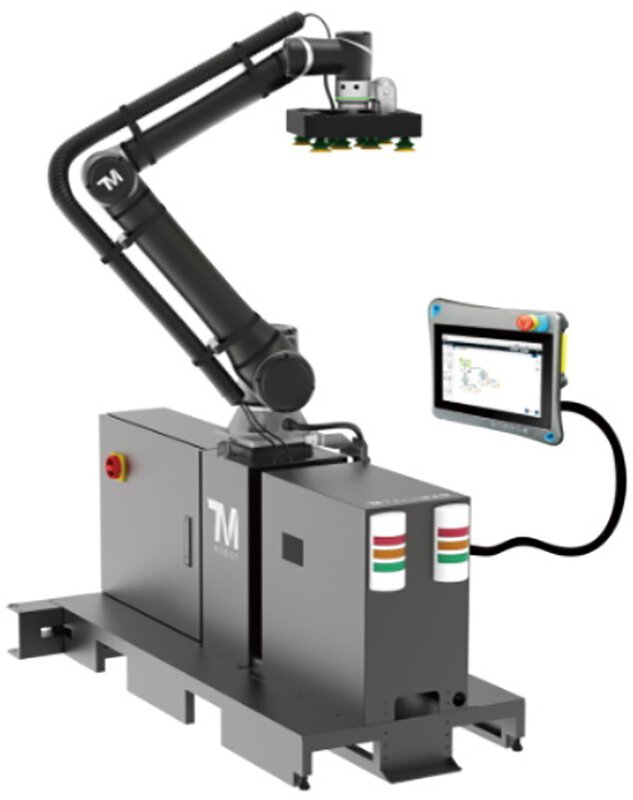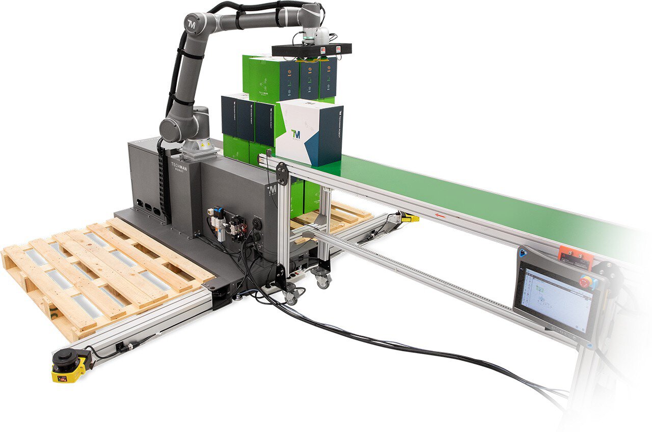 TM Palettierroboter ist eine Komplettlösung, die ausschließlich für die Palettierungsautomatisierung entwickelt wurde. Das System enthält eine integrierte Führungssoftware, mit der Benutzer ihre Palettierspezifikationen schnell einrichten können. Es können auch Palettiersimulationen und Kollisionstests im Voraus duchgeführt werden. Diese Lösung eignet sich für viele Branchen, wie Lagerhaltung, Logistik, Lebensmittelverarbeitung, Fertigung u. v. m.
