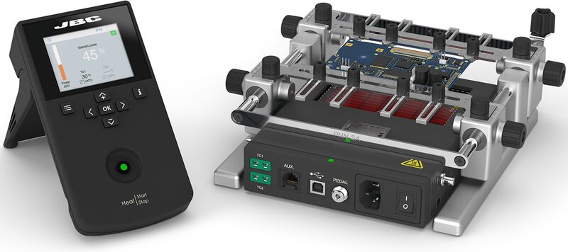 Die Nano Unterheizung/Preheater PHNE-2KA mit 230 Volt von JBC Soldering ist die beste Lösung für Rework an kleinen PCBAs, wie sie z. B. in Smartphones üblich sind. Er verfügt über eine Heizfläche von 108 x 70 mm / 4,25 x 2,75 in und zwei TC-Anschlüsse. Unvergleichliche Zuverlässigkeit bei der Temperaturgenauigkeit und Kontrolle der PCBA, so dass kein Bauteil beschädigt wird. Das Nano Preheater Set von JBC lässt sich einfach und bequem über die intuitive Menüführung bedienen.