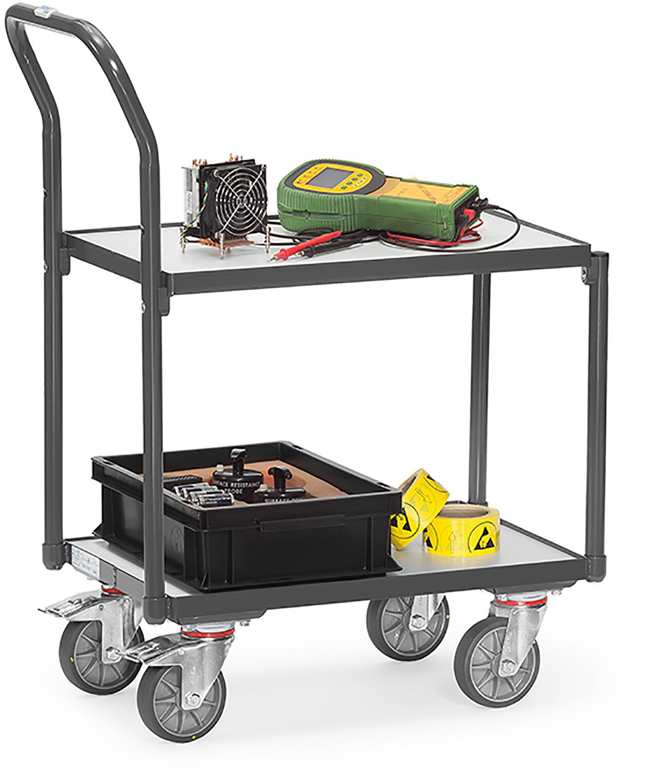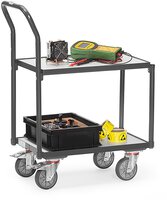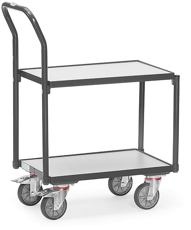 Elektrisch leitfähige Ausführung (ESD = Electrostatic Discharge). Stahlrohr und Profilstahl geschweißt, elektrisch leitfähig, pulverbeschichtet schiefergrau RAL 7015. Böden aus elektrisch leitfähiger Holzwerkstoffplatte nach DIN 68765, hellgrau. TPE-ESD-Bereifung (thermoplastisches Elastomer) elektrisch leitfähig. Naben mit Präzisions-Rillenkugellager. 4 Lenkrollen. 2 mit Feststeller, gemäß EN 1757-3 (Sicherheit von Plattformwagen). Mit Rohrschiebebügel. Mit 2 Plattformen mit Böden aus elektrisch leitfähiger Holzwerkstoffplatte, Rand 7 mm hoch. Lichter Etagenabstand 400 mm. Tragkraft obere Ladefläche 100 kg. Passend für Eurokästen 600 x 400 mm.