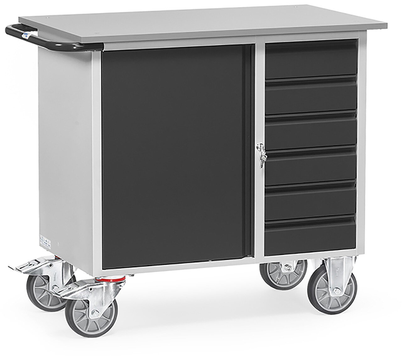 Stahlblech-Konstruktion, pulverbeschichtet, Korpus lichtgrau RAL 7035, Front anthrazitgrau RAL 7016. Mit 1 Stahlschrank, 1 festen und 2 verstellbaren Böden und 6 Schubladen (H x B x T i.L.: 95 x 280 x 470 mm). Zentralverschluss mittels Zylinderschloss. Arbeitsfläche Sandwich-Platte 19 mm stark. 2 Lenk- und 2 Bockrollen, TPE-Bereifung, Naben mit Rillenkugellager. Feststeller an den Lenkrollen, gemäß der Europäischen Norm EN 1757-3 (Sicherheit von Plattformwagen). Tragkraft pro Einlegeboden im Stahlschrank 80 kg, pro Schublade 35 kg.