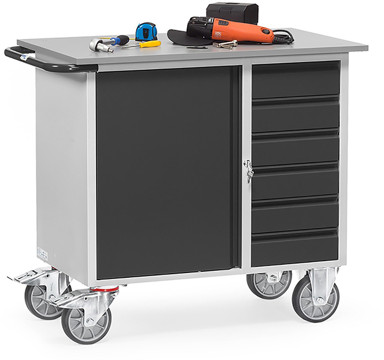 Stahlblech-Werkstattwagen "GREY EDITION", Tragkraft 400kg, 1 Schrank und 6 Schubladen, 985x590mm