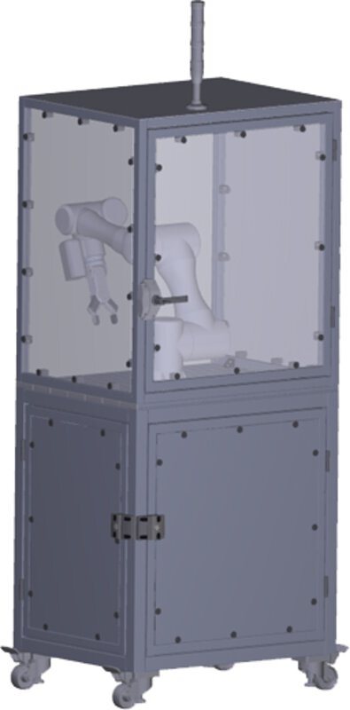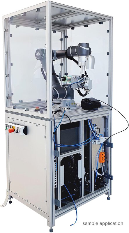 Die Arbeitsstation mit integriertem Arbeitsbereich. Die Steuerung wird im Inneren der Arbeitsstation verstaut, und ist durch seitliche Öffnungen leicht zu erreichen. Optional mit eingebauter SPS, Druckluftanschlüssen und TP-100-1 TM Kit. Geeignet für TM5, TM12 und TM14.