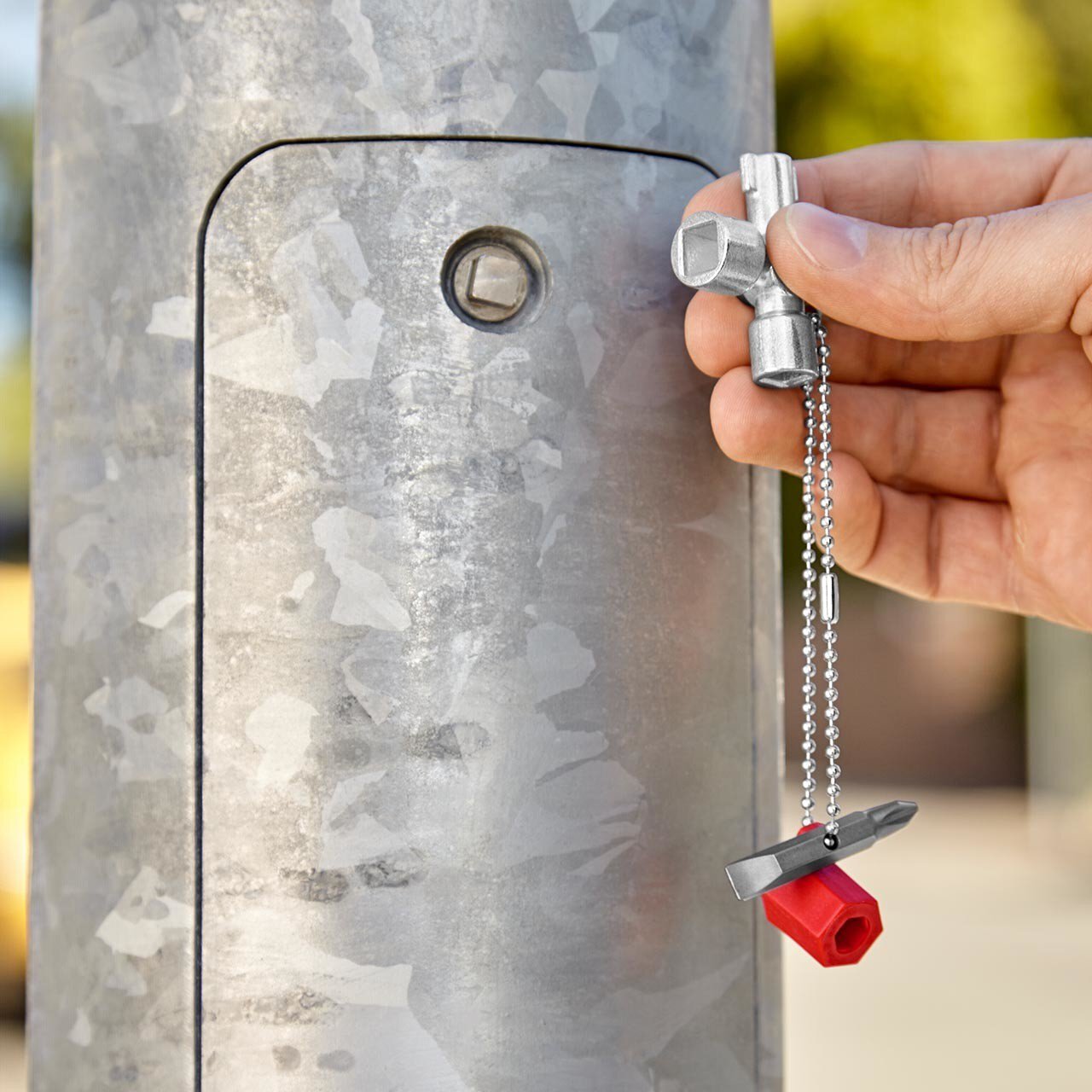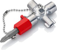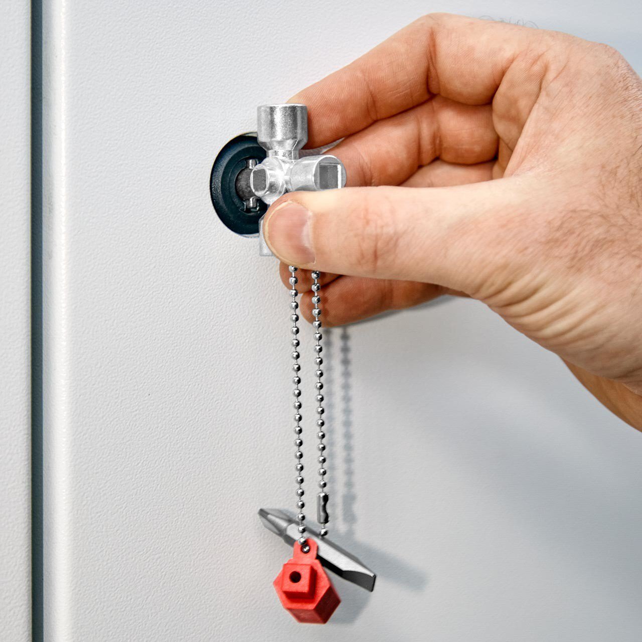 Für Schaltschränke, Absperrsysteme der Gas-, Wasser- und Elektrizitätsversorgung. Für technische Anlagen in Gebäuden wie Klima- und Belüftungsanlagen, Absperrventile, Netzschalttafeln usw.. Mit Bit-Einsatz: Schlitz 1,0 x 7 mm und Kreuzschlitz PH2. Mit Adapter für 1/4"-Bits an einer Befestigungskette. Zusätzliche Bitaufnahme für 1/4"-Bits in einem Arm. kurze Ausführung, Armlänge gesamt: 44 mm. - Kapazität Vierkant: 6,0 / 8,0mm - Kapazität Doppelbart: 3 - 5mm - Kapazität Dreikant: 9,0mm
