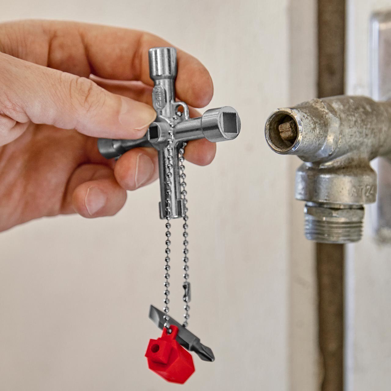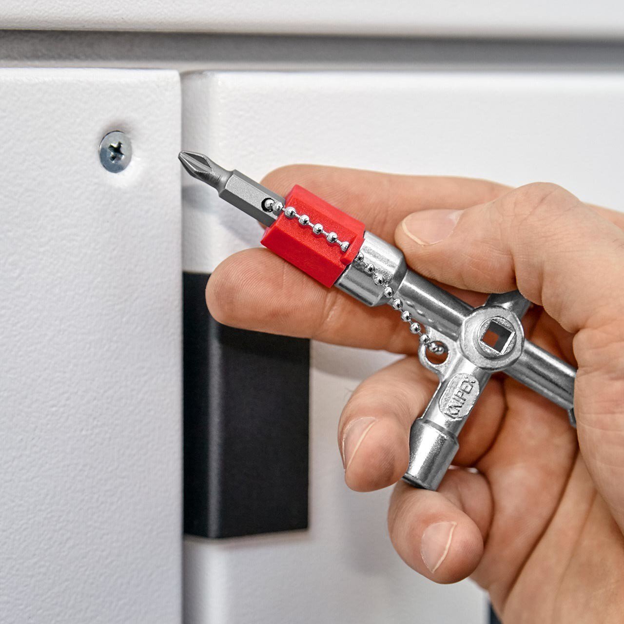 Für Schaltschränke, Absperrsysteme der Gas-, Wasser- und Elektrizitätsversorgung. Für technische Anlagen in Gebäuden wie Klima- und Belüftungsanlagen, Absperrventile, Netzschalttafeln usw.. Mit Bit-Einsatz: Schlitz 1,0 x 7 mm und Kreuzschlitz PH2. Mit Adapter für 1/4"-Bits an einer Befestigungskette. Zusätzliche Bitaufnahme für 1/4"-Bits in einem Arm. lange Ausführung, Armlänge gesamt: 76 mm. zusätzlicher Vierkant 5 mm. - Kapazität Vierkant: 5,0 / 6,0 / 8,0mm - Kapazität Doppelbart: 3 - 5mm - Kapazität Dreikant: 9,0mm