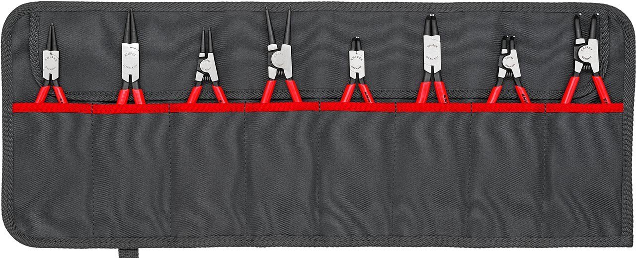 Rolltasche aus strapazierfähigem Polyester-Gewebe. Mit praktischem, verstellbarem Schnellverschluss. acht gängige Sicherungsringzangen für Innen- und Außenringe. Abmessungen, geöffnet (L x H): 610 x 240 mm. Lieferumfang: 1 x 44 11 J1 KNIPEX Sicherungsringzange für Innenringe in Bohrungen (Ø 12 - 25 mm), 1 x 44 11 J2 KNIPEX Sicherungsringzange für Innenringe in Bohrungen (Ø 19 - 60 mm), 1 x 44 21 J11 KNIPEX Sicherungsringzange für Innenringe in Bohrungen (Ø 12 - 25 mm), 1 x 44 21 J21 KNIPEX Sicherungsringzange für Innenringe in Bohrungen (Ø 19 - 60 mm), 1 x 46 11 A1 KNIPEX Sicherungsringzange für Außenringe auf Wellen, 1 x 46 11 A2 KNIPEX Sicherungsringzange für Außenringe auf Wellen, 1 x 46 21 A11 KNIPEX Sicherungsringzange für Außenringe auf Wellen, 1 x 46 21 A21 KNIPEX Sicherungsringzange für Außenringe auf Wellen,