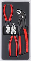 Werkzeuge im Kunststoff-Tiefziehteil mit transparentem Deckel. Abmessungen (B x H x T): 170 x 370 x 40 mm. Lieferumfang: 1 x 02 01 180 KNIPEX Kraft-Kombizange (35 % Kraftersparnis), 1 x 87 01 250 KNIPEX Cobra® Hightech-Wasserpumpenzange, 1 x 74 01 160 KNIPEX Kraft-Seitenschneider (Optimal für alle Drahtsorten),