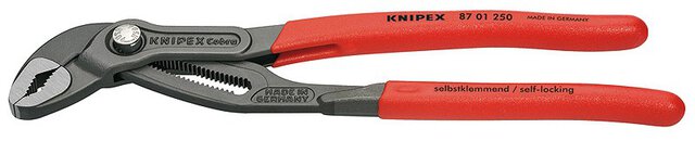Die Wasserpumpenzange Knipex Cobra wird aus Chrom-Vanadin-Elektrostahl geschmiedet. Direkt am Werkstück erfolgt die Einstellung der Öffnungsweite: obere Backe ans Werkstück anlegen, Knopf drücken, untere Backe heranschieben, Knopf loslassen, Zange passgenau eingestellt. Eine handfreundliche Griffstellung findet man mit der Feinverstellung. Dank Selbstklemmeffekt kann alle Handkraft z.B. in eine Drehbewegung fließen. Durch 250 mm Zangenlänge entwickelt sich eine hohe Hebelkraft, die von den zusätzlich induktiv gehärteten Greifzähnen dauerhaft sicher auf die Werkstücke übertragen wird.
