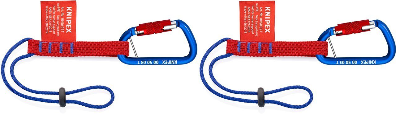 Sicherungssystem-Set zum Einsatz im Hochbau, Tiefbau, Gebäudeinstandhaltung; bei Industriekletterern, Dachdeckern, Bergsteigern, im Klettersport, Messebau. Ermöglicht zuverlässigen Schutz vor Herunterfallen und kann schwere Verletzungen, Sachschäden oder den Verlust des Werkzeugs verhindern. Adapterschlaufe aus rotem Flachriemen lässt sich direkt mit der Kordelseite an Tethered-Tools-Werkzeugen, Handgelenk, Kletterausrüstung usw. befestigen. Ermöglicht schnellen Wechsel von der Sicherung an der Werkzeugtasche zur Fangleine. Max. Belastung: 1,5 kg Werkzeuggewicht. Passend für alle KNIPEX-Zangen mit Befestigungsöse. Inhalt: 2 Adapterschlaufen 00 50 02 T, jeweils mit angebrachtem Materialkarabiner 00 50 03 T. Nicht für die Personensicherung zugelassen!. - Belastbarkeit: 1,5 kg / 3,3 lbs Lieferumfang: 2 x 00 50 02 T BK KNIPEX Adapterschlaufe (3 Adapterschlaufen), 2 x 00 50 03 T BK KNIPEX Materialkarabiner 2 Stück (2 Materialkarabiner),