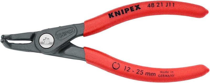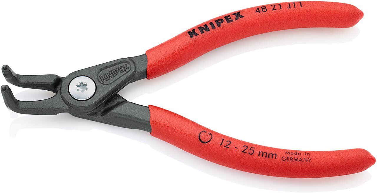 Präzisions-Sicherungsringzange hoch belastbar im Dauereinsatz: bis zu 10-fach höhere Standzeit gegenüber angedrehten Spitzen. Mit eingesetzten Spitzen für sicheres Arbeiten. Geschraubtes Gelenk: präziser, spielfreier Gang der Zange. Rutschhemmender Kunststoffüberzug an den Griffen. gewinkelte Spitzen. - Form: 2 - Kapazität für Bohrungsdurchmesser: Ø 12 - 25mm - Spitzen (Durchmesser): Ø 1,3mm