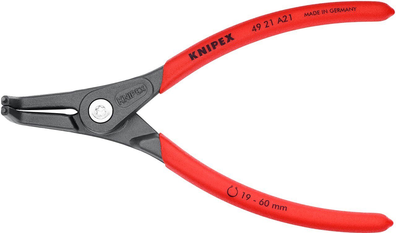Präzisions-Sicherungsringzange hoch belastbar im Dauereinsatz: bis zu 10-fach höhere Standzeit gegenüber angedrehten Spitzen. Mit eingesetzten Spitzen für sicheres Arbeiten. Große Auflageflächen an den Spitzen: keine Verwindung der Ringe, leichte Montage. Geschraubtes Gelenk: präziser, spielfreier Gang der Zange. Im Gelenk liegende Öffnungsfeder, geschützt und unverlierbar. Rutschhemmender Kunststoffüberzug an den Griffen. gewinkelte Spitzen. - Kapazität für Wellendurchmesser: Ø 19 - 60mm - Form: 2 - Spitzen (Durchmesser): 1,8mm