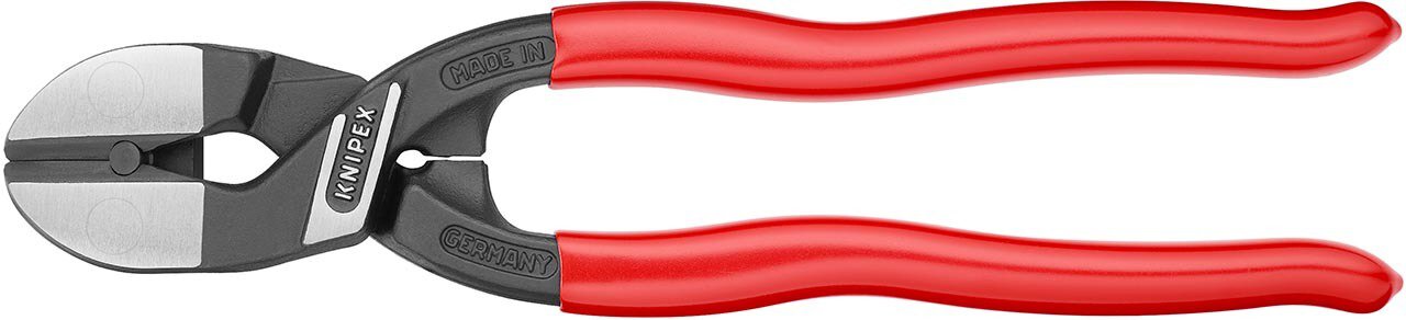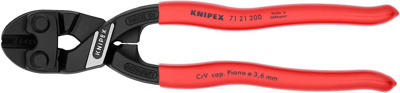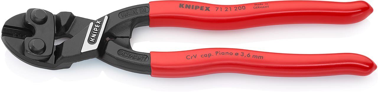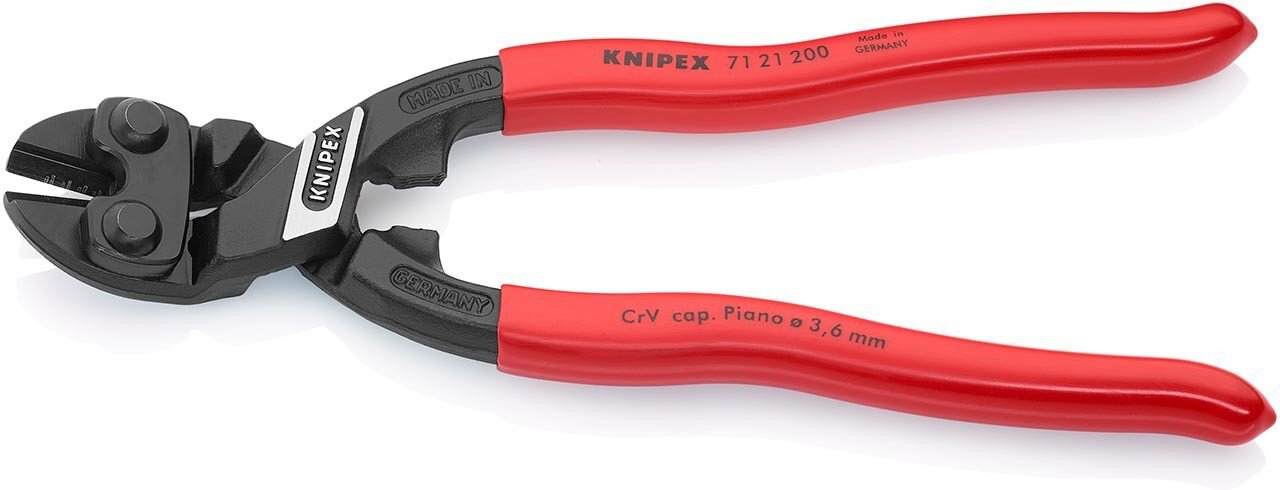 KNIPEX CoBolt® Mit Präzisionsschneiden für weichen, harten Draht sowie Pianodraht. Schneidet Bauteile wie Bolzen, Nägel, Niete usw. bis Ø 5,2 mm. Besonders hohe Schneidleistung bei geringerem Kraftaufwand durch höchst effiziente Gelenkkonstruktion. Schneiden zusätzlich induktiv gehärtet, Schneidenhärte ca. 64 HRC. 20° gewinkelter Kopf mit einseitiger Lasche und Seitenschnitt zum bündigen Schneiden, mit Freiraum zum Greifen. - Form: 2 - Schneidwerte weicher Draht (Durchmesser): Ø 6mm - Schneidwerte mittelharter Draht (Durchmesser): Ø 5,2mm - Schneidwerte harter Draht (Durchmesser): Ø 4,0mm - Schneidwerte Pianodraht (Durchmesser): Ø 3,6mm