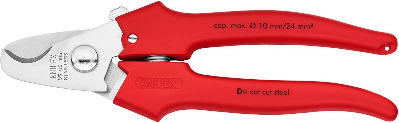 Nicht für Stahldraht und hartgezogene Kupferleiter geeignet. Gehärtete Schneiden mit Präzisionsschliff. Kein Quetschen, geringe Verformung des Kabels. Klemmschutz verhindert Quetschverletzungen. Nachstellbares Schraubgelenk. zum Schneiden von Kabeln Ø 10 mm / 24 mm². Mit Öffnungsfeder und Sperrklinke. Schneiden aus rostfreiem Stahl. in Öl gehärtet und angelassen. - Schneidwert Cu-Kabel, mehrdrähtig: 24mm² - Schneidwert Cu-Kabel, mehrdrähtig: Ø 10mm - AWG: 3