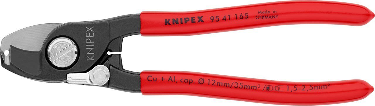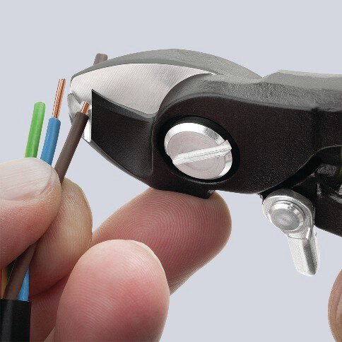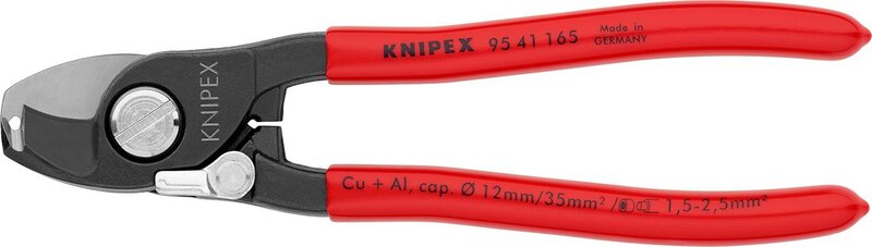 Zum Schneiden von Cu- und Al-Kabeln, ein- und mehrdrähtig. Schneidet glatt und sauber, ohne zu quetschen. Nicht für Stahldraht und hartgezogene Kupferleiter geeignet. Gehärtete Schneiden mit Präzisionsschliff. Leichter Schnitt bei Einhandbedienung. Mit Klemmschutz. Nachstellbares Schraubgelenk, selbstsichernd. Mehrfunktionswerkzeug zum Verarbeiten von NYM-Kabeln von 3 x 1,5 mm² bis 5 x 2,5 mm² (Schneiden und Abisolieren). universelle Abisolierstelle für beide Massivleiter-Querschnitte. sichere Zentrierung des Kabels in der Abisolierstelle durch V-förmige Schneidengeometrie. - Form: 4 - Schneidwert Cu-Kabel, mehrdrähtig: 35mm² - Schneidwert Cu-Kabel, mehrdrähtig: Ø 12mm - AWG: 1 / 0