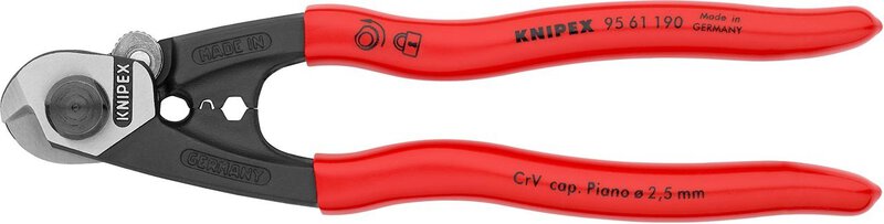 Mit zwei Pressprofilen für Endhülsen an Bowdenhüllen und Endkappen für Drahtseilzüge. Komfortables Arbeiten durch handliche, schlanke Bauform und innenliegende Öffnungsfeder. Geschraubtes Gelenk für präzise Messerführung, nachstellbar. Hohe Übersetzung für kraftsparendes Arbeiten. Schneidenhärte ca. 64 HRC. - Schneidwert Cu-Kabel, mehrdrähtig: 10mm² - Schneidwert Cu-Kabel, mehrdrähtig (Durchmesser): Ø 7,0mm - Schneidwert Cu-Kabel, feindrähtig (Durchmesser): Ø 6,0mm² - Schneidwerte Drahtseil (Durchmesser): Ø 5,0mm - Schneidwerte mittelharter Draht (Durchmesser): Ø 4,0mm - Schneidwerte Pianodraht (Durchmesser): Ø 2,5mm - Schneidwerte Eisen (Durchmesser): Ø 4mm - AWG: 7