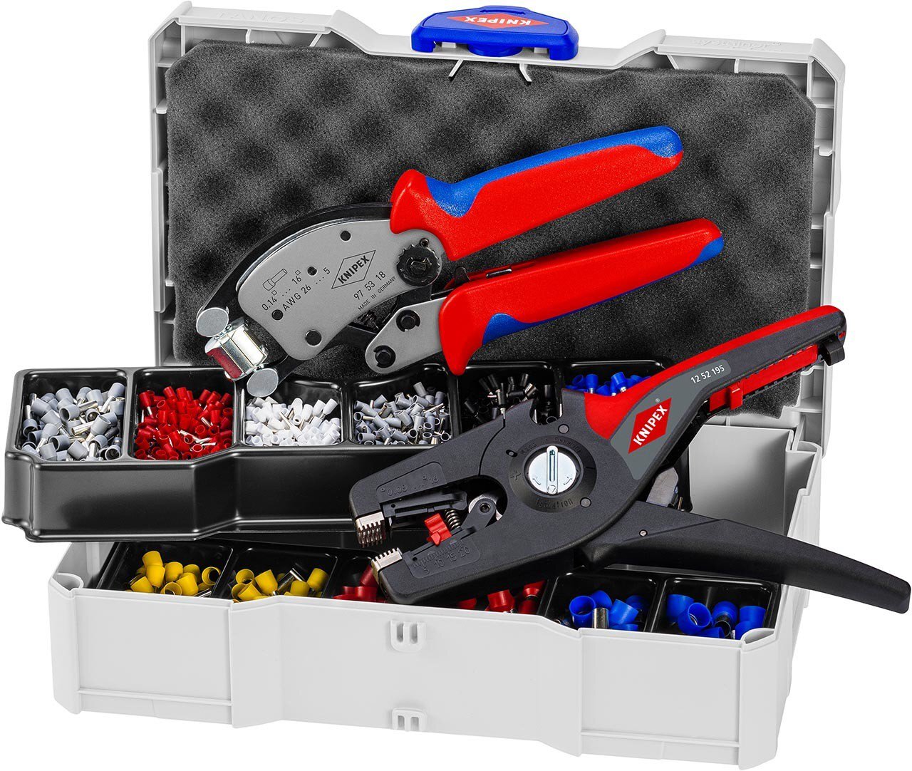Im TANOS MINI-systainer® (stabile Kunststoffbox). Zwei stapelbare Kunststoffeinsätze mit je sechs Mulden für Verbinder. Mit einem Sortiment Aderendhülsen mit / ohne Kunststoffkragen. T-Loc-Verschluss für Einhandbedienung: mit einem Dreh den systainer® öffnen oder schließen und mit einem zweiten systainer® verbinden.. mit Crimpzange für Aderendhülsen KNIPEX Twistor16® 97 53 18 und automatischer Abisolierzange KNIPEX PreciStrip16 12 52 195. Lieferumfang: 1 x 97 53 18 KNIPEX Twistor16® Selbsteinstellende Crimpzange für Aderendhülsen mit drehbarem Crimpkopf (0,14 - 16 mm²), 1 x 12 52 195 KNIPEX PreciStrip16 Automatische Abisolierzange (0,08 - 16 mm²),