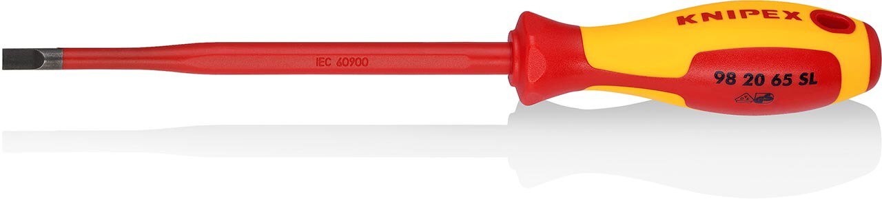 Schraubendreher (Slim) für Schlitzschrauben: Reduzierter Klingenisolationsdurchmesser für tiefliegende Feder- und Schraubelemente.: Ergonomisch optimierter 2-Komponenten-Griff für ermüdungsarme und handschonende Kraftübertragung. Rollhemmende Griffform. - Klingenlänge: 150mm - unisolierte Klingenlänge: 15mm - Grifflänge: 112mm - Schneidenbreite: 6,5mm - Schneidendicke: 1,2mm - VDE-geprüft: Ja