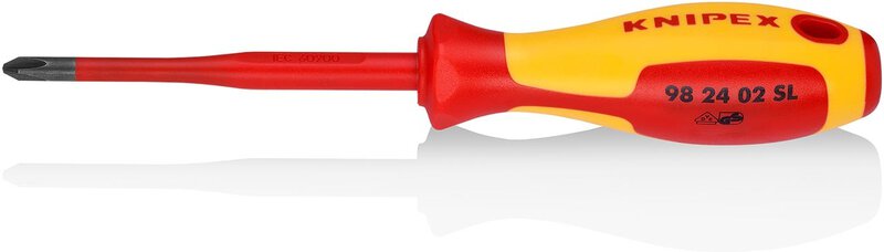 Schraubendreher (Slim) für Kreuzschlitzschrauben: Reduzierter Klingenisolationsdurchmesser für tiefliegende Feder- und Schraubelemente.: Ergonomisch optimierter 2-Komponenten-Griff für ermüdungsarme und handschonende Kraftübertragung. Rollhemmende Griffform. - Größe: PH2 - Klingenlänge: 100mm - Grifflänge: 112mm - unisolierte Klingenlänge: 18mm - VDE-geprüft: Ja