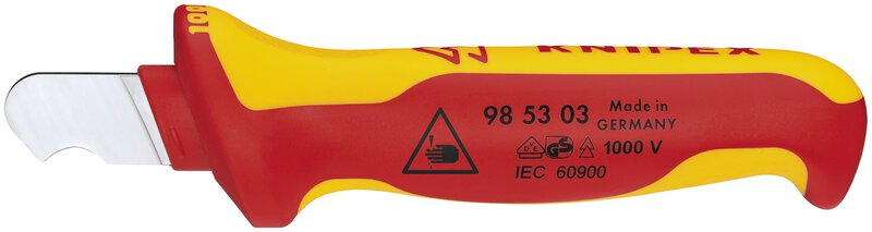Ergonomisch gestaltete Griffform mit angenehm gestaltetem Abgleitschutz. Mehr Sicherheit durch rutschfeste Weichkomponente. Gute Kraftübertragung beim Ziehen des Messers durch Daumenmulde und "Fingerhaken" am Griffende. Transparente Schutzkappe. stabile, feststehende Hakenklinge. geeignet für Rundkabel. Klinge: Spezial-Werkzeugstahl, ölgehärtet. - Klingenlänge: 28mm - Radius: 7mm - VDE-geprüft: Ja