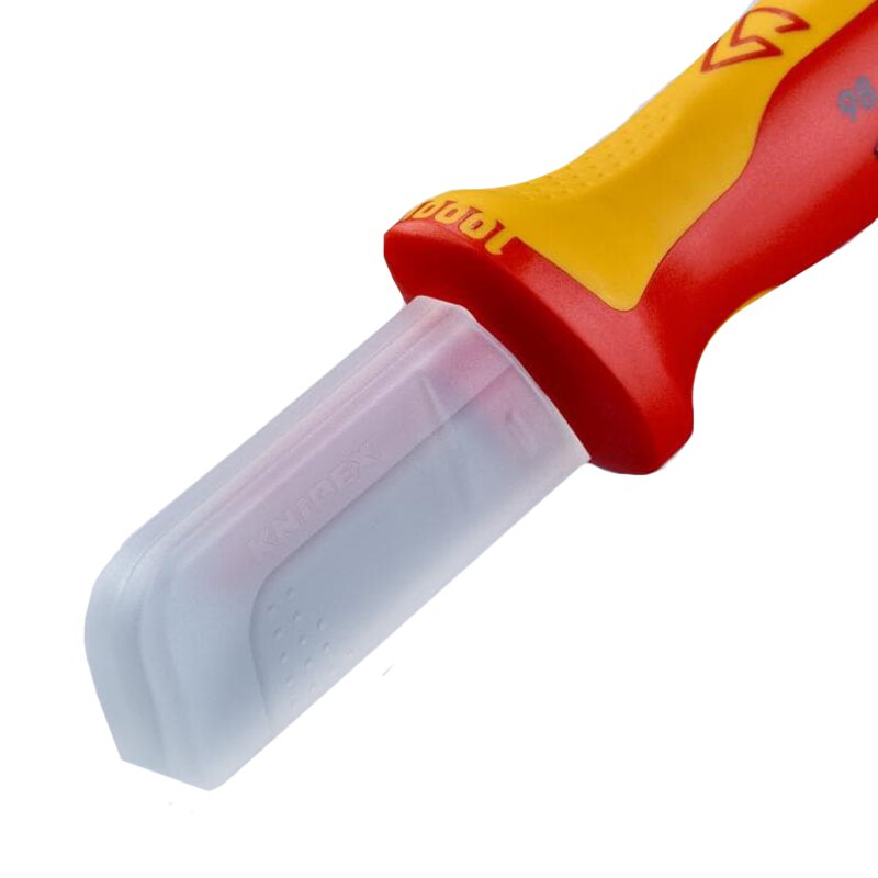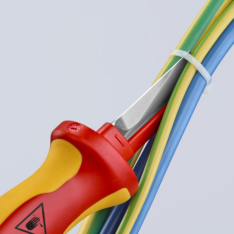 Ergonomisch gestaltete Griffform mit angenehm gestaltetem Abgleitschutz. Mehr Sicherheit durch rutschfeste Weichkomponente. Gute Kraftübertragung beim Ziehen des Messers durch Daumenmulde und "Fingerhaken" am Griffende. Stabile, feststehende Klinge mit gerader Schneide. Transparente Schutzkappe. Gute Kraftübertragung beim Ziehen des Messers durch Daumenmulde und "Fingerhaken" am Griffende. Klingenrücken zur Vermeidung von Kurzschlüssen mit Kunststoff überzogen. - Klingenlänge: 50mm - VDE-geprüft: Ja