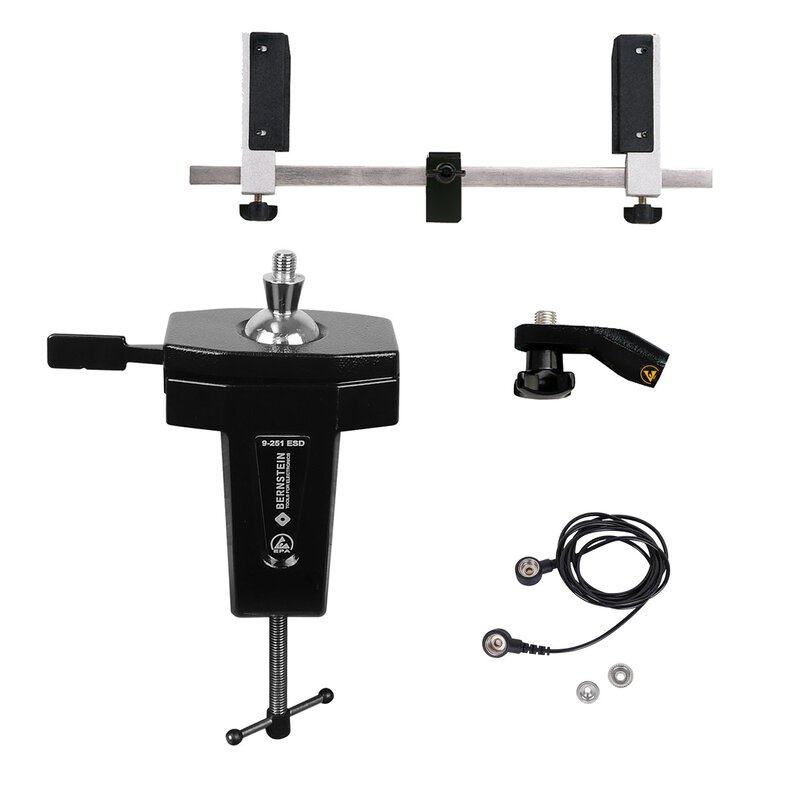 | Lieferumfang | Kugelgelenk-Kombination bestehend aus: 9-251 ESD Kugelgelenk-Fußteil SPANNFIX zum Anklemmen (Gewindezapfen 12mm) 9-253 ESD Platinenhalterung zum Aufschrauben (M12x1,5) 9-255 ESD Winkeladapter SPANNFIX zum Aufschrauben (M12x1,5) 9-343-1 ESD Erdungsleitung 1 MOhm, 1800mm 2DK 10/10 |