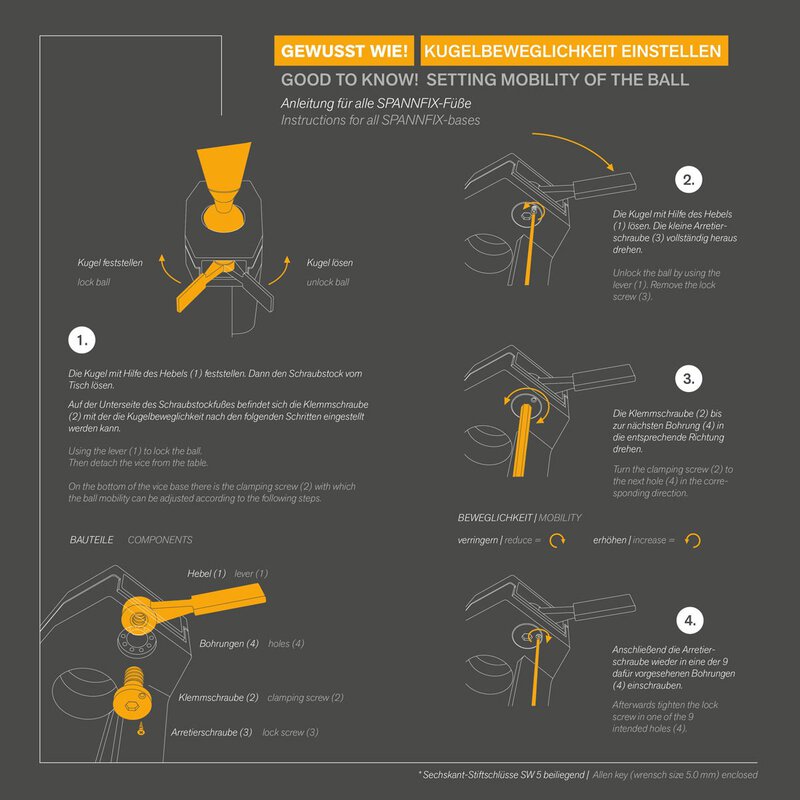 Mit dem SPANNFIX VARIO können PCB`s / Platinen bis zu einer Länge von 270 mm eingespannt werden. Durch die stufenlos einstellbare Kugel kann die Platine sicher in sämtliche Richtungen positioniert und gehalten werden. Ein schnelles Wenden der PCB`s / Platinen ist dank des Adapters möglich, der in +/- 45° Schritten dreh- und feststellbar ist. Die Stellschrauben mit ergonomischen Griff sind leichtgängig und erleichtern das Einstellen.