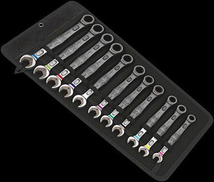 Hochwertiger Ratschenschlüssel-Satz von Wera: alles, was ein Schraubenschlüssel können muss. Und noch eine ganze Menge mehr. Schneller, besser, schicker. Ja, ein echter Joker. Die neue Generation der Ringratschenschlüssel. 11-teiliges Set im robusten Etui. Geeignet für Sechskant-Schraubenköpfe oder Muttern. Mit Haltefunktion, dank der Metallplatte im Maul, die das Risiko des Herunterfallens von Schrauben und Muttern verringert. Die auswechselbare Metallplatte in der Backe sichert Muttern und Schrauben mit ihren extra harten Zähnen und begrenzt die Gefahr des Abrutschens. Der integrierte Endanschlag verhindert ein Abrutschen am Schraubenkopf und ermöglicht ein höheres Drehmoment. Die Doppelhex-Geometrie sorgt für eine formschlüssige Verbindung mit Muttern oder Schrauben und verringert die Gefahr des Abrutschens. Ein Rückstellwinkel von nur 30° am offenen Ende verhindert ein zeitaufwändiges Umdrehen des Schlüssels bei Schraubarbeiten. Der Ratschenmechanismus am Ringende mit einer außergewöhnlichen, feinverzahnten Mechanik - insgesamt 80 Zähne - ermöglicht Flexibilität auch in sehr engen Arbeitsräumen. Die speziell geschmiedete Geometrie sorgt für eine hohe Drehmomentübertragung und Festigkeit. Gefertigt aus Hochleistungs-Chrom-Molybdän-Stahl mit Nickel-Chrom-Beschichtung für hohen Korrosionsschutz. "Take it easy"-Werkzeugsucher mit Farbcodierung nach Größen.