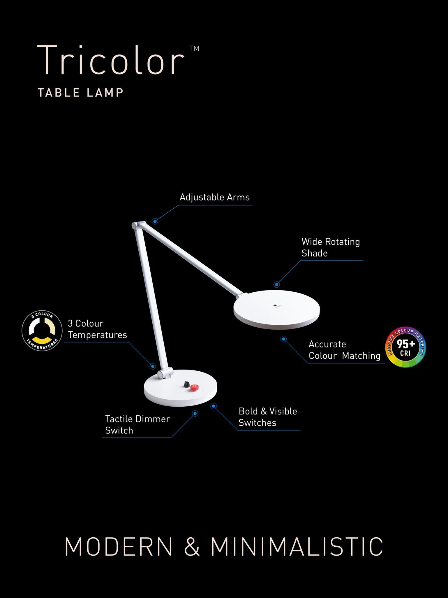 Dank einstellbarer Helligkeit und verschiedener Farbtemperaturen finden Sie leicht bei der LED Tischleuchte Tricolor von Daylight die für Ihr Sehvermögen optimalen Einstellungen. Mit ihren großen und gut sichtbaren Schaltern ist die Tricolor nicht nur ästhetisch ansprechend, sondern auch einfach zu bedienen. Der große Schirm mit 16,5 cm Durchmesser sorgt für eine hervorragende Lichtverteilung, während sich die Helligkeit über den Dimmer-Tastschalter einstellen lässt.