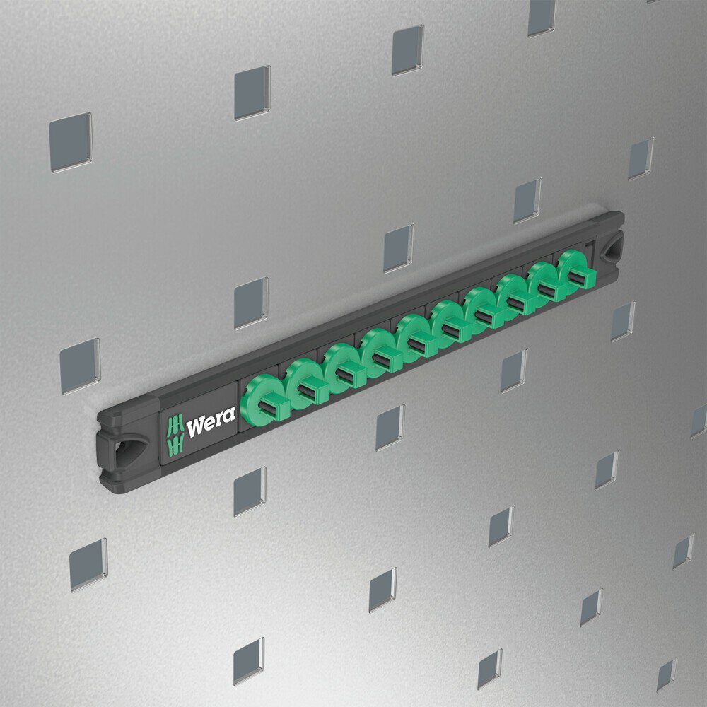 1 Nuss-Magnetleiste, unbestückt. Für bis zu 10 Steckschlüsseleinsätze und/oder Bitnüsse mit 1/4"-Antrieb. Die Magnetleiste ermöglicht die temporäre Anbringung an metallischen Oberflächen und verfügt dank der Twist to unlock Funktion über eine sichere Nussverriegelung und -entriegelung.