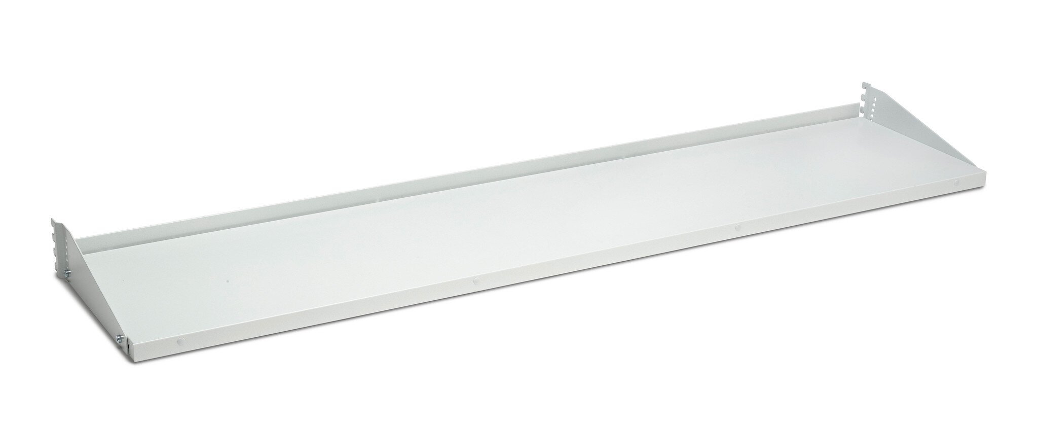 Robuster Stahl-Fachboden mit Schutzkante, vorne. Mit Befestigungspunkten für TNL-Leuchten.