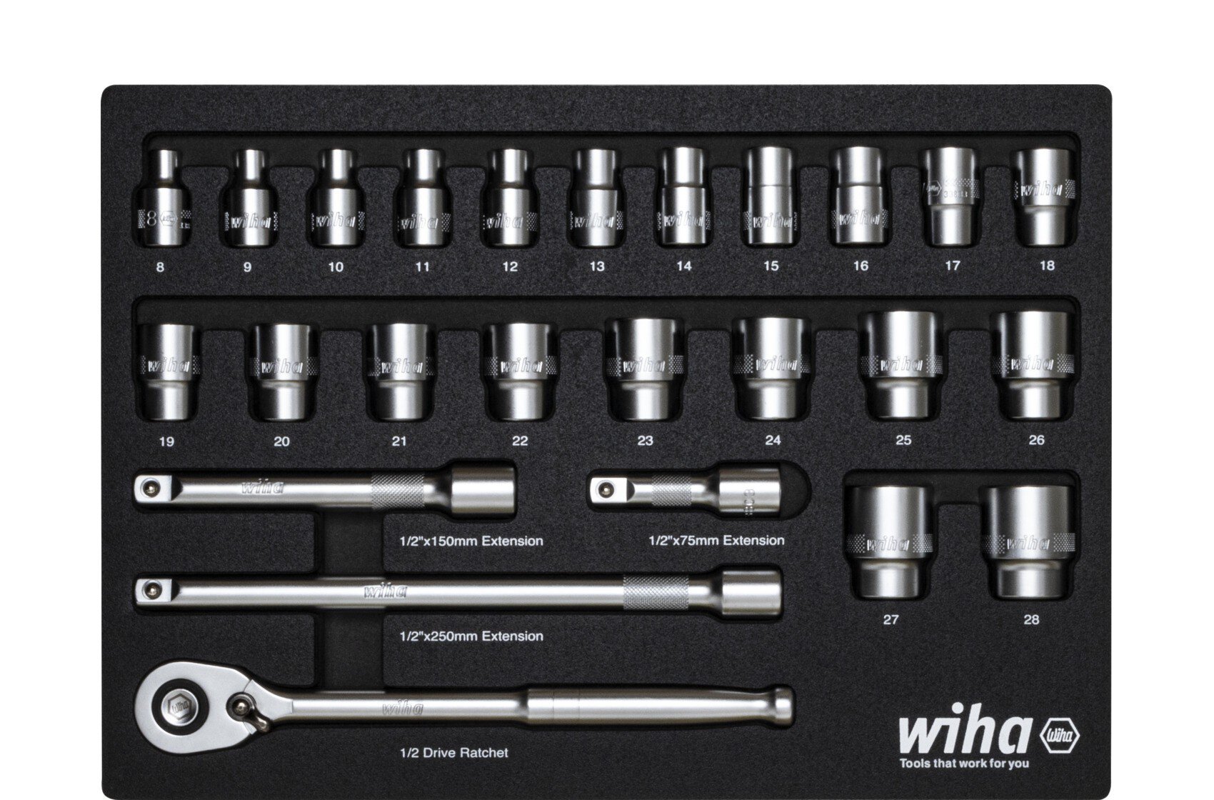 Stark festgezogene Schrauben zu öffnen erfordert einen enormen Kraftaufwand. Mit den Steckschlüsseleinsätzen von Wiha bekommt der Anwender jede Verschraubung einfach geöffnet. Mit dem Set aus den 21 gängigsten 1/2" Steckschlüsseleinsätzen in den Größen von 8 - 28 mm, einem Ratschenschlüssel und drei Verlängerungen ist der Anwender bestens ausgestattet. Der beiliegende Ratschenschlüssel verleiht dem Anwender in Kombination mit der Auswahl an Steckschlüsseln die notwendige Flexibilität im Arbeitseinsatz. Bei Arbeiten mit dem Ratschenschlüssel hat der Anwender dank der Feinverzahnung mit 72 Zähnen einen kurzen Rückholwinkel. Dabei kann der Rechts-/ Linkslauf durch den integrierten Umschalthebel variabel eingestellt werden. In Kombination mit den beiliegenden Verlängerungen können tiefliegende Muttern und Schrauben problemlos erreicht werden. Die Steckschlüssel und Verlängerungen werden mechanisch verriegelt. Der Wechsel erfolgt durch Drücken des Auslöseknopfs. Hergestellt aus hochwertigem Chrom-Vanadium-Stahl stehen die Steckschlüsseleinsätze für Langlebigkeit und Robustheit, nicht zuletzt dank ihrer korrosionsbeständigen und leicht zu reinigenden Oberfläche. Der gesamte Set Inhalt ist geordnet und übersichtlich in einer Schaumstoffeinlage aufbewahrt, in welcher das schnelle Finden des passenden Steckschlüssels durch Kennzeichnungen unterstützt wird.