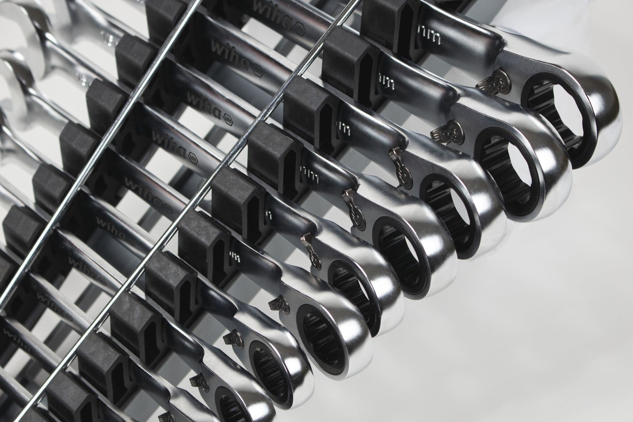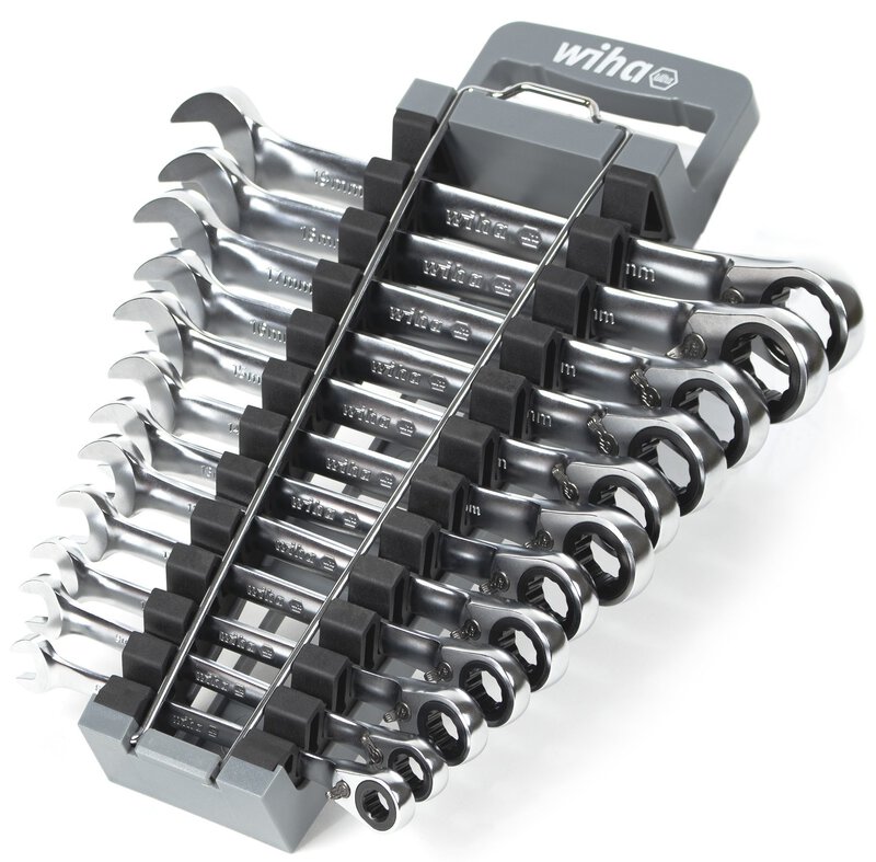 Stark festgezogene Schrauben zu öffnen erfordert einen enormen Kraftaufwand. Mit den Ringratschen-Gabelschlüsseln von Wiha bekommt der Anwender durch die Hebelwirkung jede Verschraubung einfach geöffnet. Zudem eignet sich das Ende mit dem Maul hervorragend zum Kontern von Schrauben und Muttern. Mit einer Maulstellung von 15° ist das Maul-Ende perfekt für das Arbeiten an Engstellen geeignet. Auch beim Arbeiten mit der Ringratsche hat der Anwender dank der Feinverzahnung mit 72 Zähnen einen kurzen Rückholwinkel und durch den Doppel-Sechskant höchste Komfortabilität bei Arbeiten im beengten Arbeitsumfeld. Dabei kann der Rechts-/ Linkslauf durch den integrierten Umschalthebel variabel eingestellt werden. Hergestellt aus hochwertigem Chrom-Vanadium-Stahl stehen die Ringratschen-Gabelschlüssel für Langlebigkeit und Robustheit, nicht zuletzt dank ihrer korrosionsbeständigen und leicht zu reinigenden Oberfläche. Das Set beinhaltet die 12 gängigsten Größen von 8 bis 19 mm, ordentlich verstaut in einer praktischen Halterung. Die Halterung kann mit nur einer Hand geöffnet werden, um die passende Größe daraus zu entnehmen.Dabei verhilft die griffige Oberfläche, zu starkem Halt selbst in öligen oder nassen Arbeitssituationen.