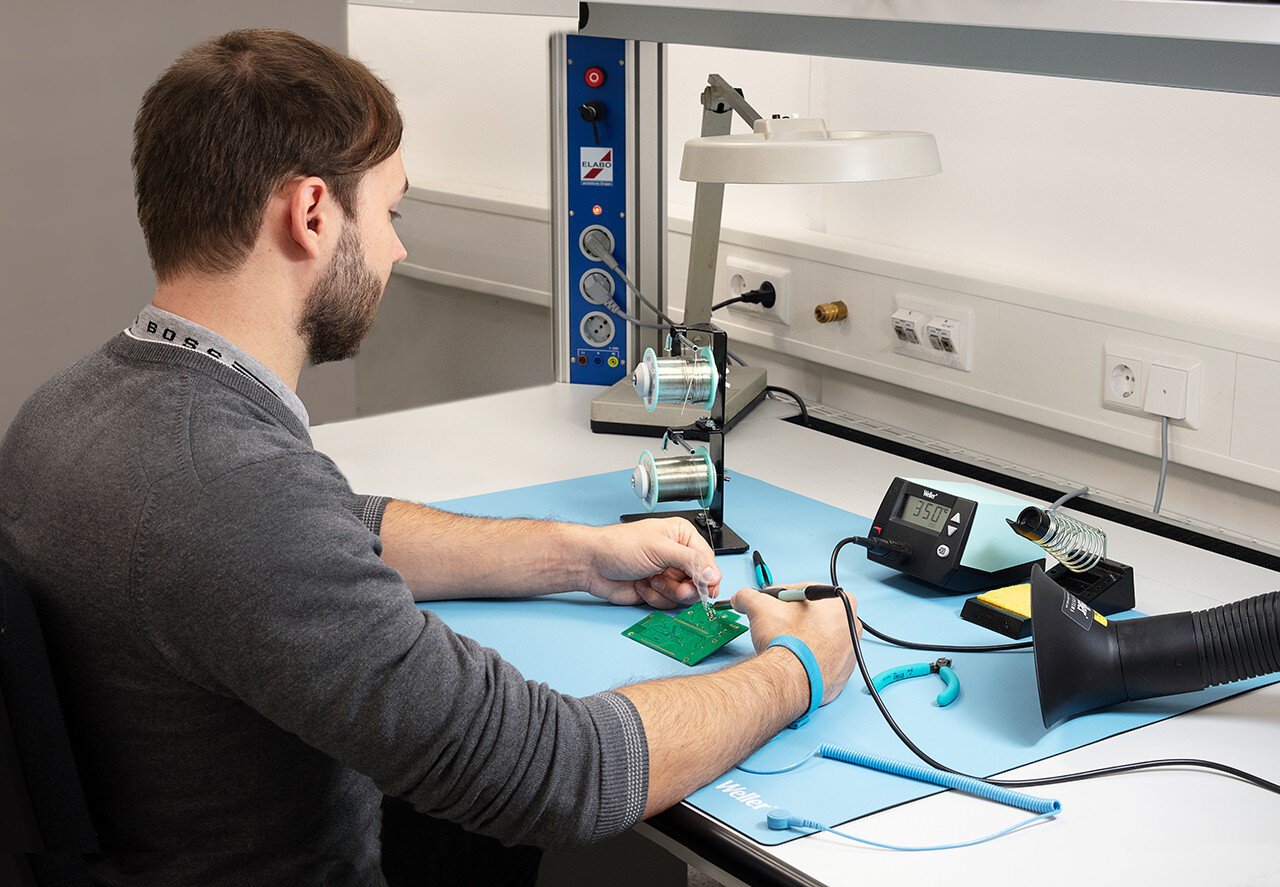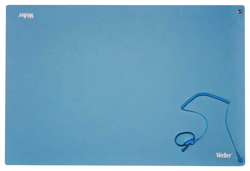 Das ESD Tischmatten Set ist mit einer hochwertigen ESD Tischmatte und dem passenden Zubehör bestückt, um einen ESD-sicheren Arbeitsplatz auszustatten. Die Matte ist unter anderem hitze-, lötzinn-, öl- und chemikalienbeständig. Beinhaltet sind zudem ein ESD Armband mit 10 mm Druckknopf, ein Spiralkabel mit 1 MOhm sowie zwei 10 mm Druckknöpfe.