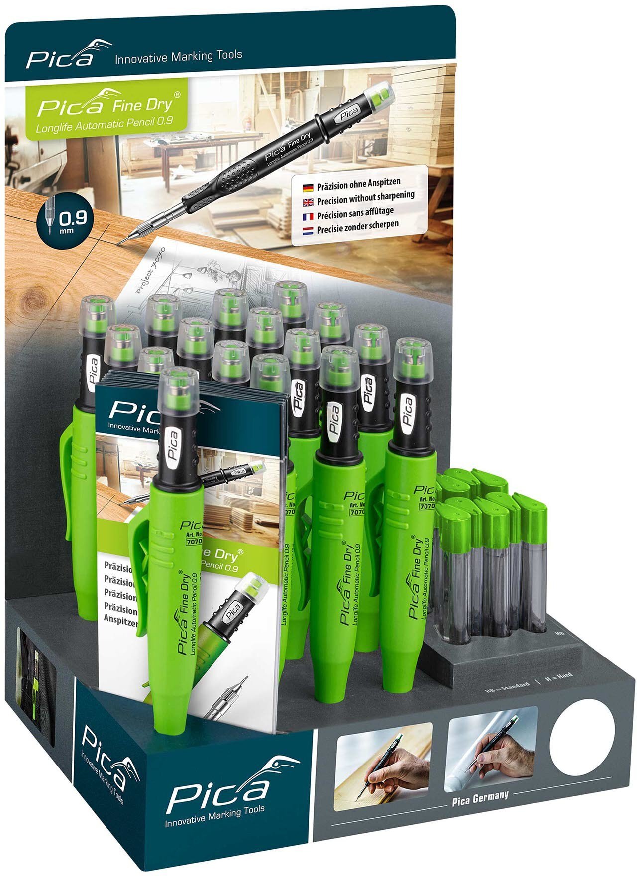 • Inhalt: 20 x 7070 Pica Fine-Dry Longlife Automatic Pen 0.9 ; 10 x 7030 Pica Fine-Dry Ersatzminen-Etuis "Graphit HB" ; 5 x 7050 Pica Fine-Dry Ersatzminen-Etuis "Graphit H"10 Info-Flyer