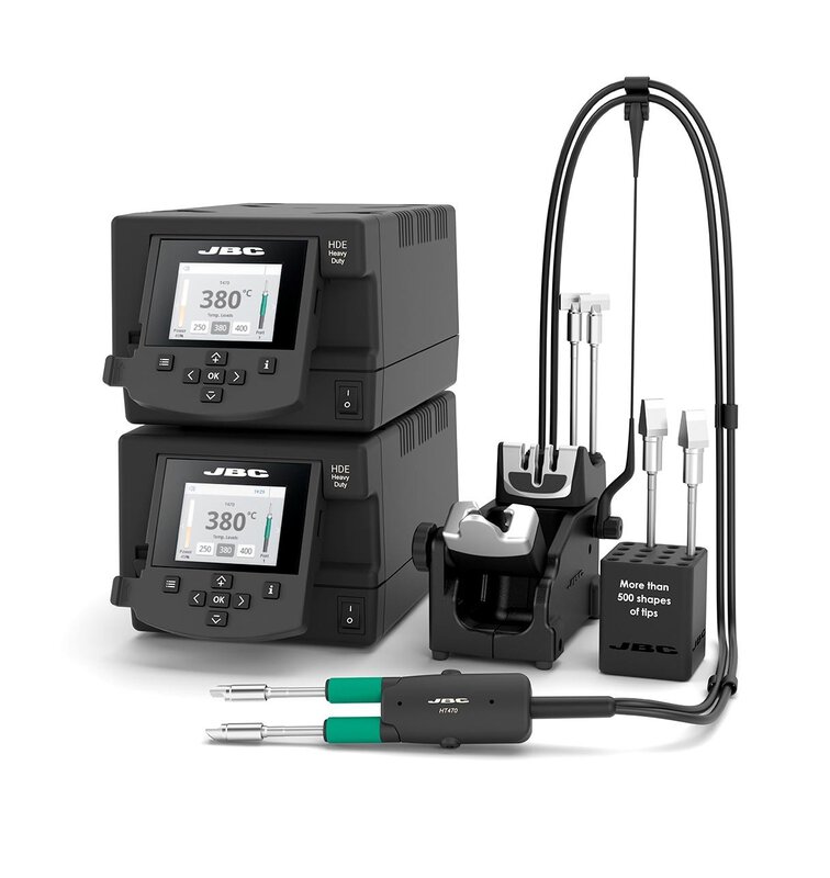 Diese Station wird mit SCH Kartuschenhalter, 2 HDEU-Steuergeräten, dem leistungsstärksten Lötgerät der JBC-Reihe, und mit der HT470 HD-Thermopinzette geliefert, die das C470-Patronenprogramm verwendet.