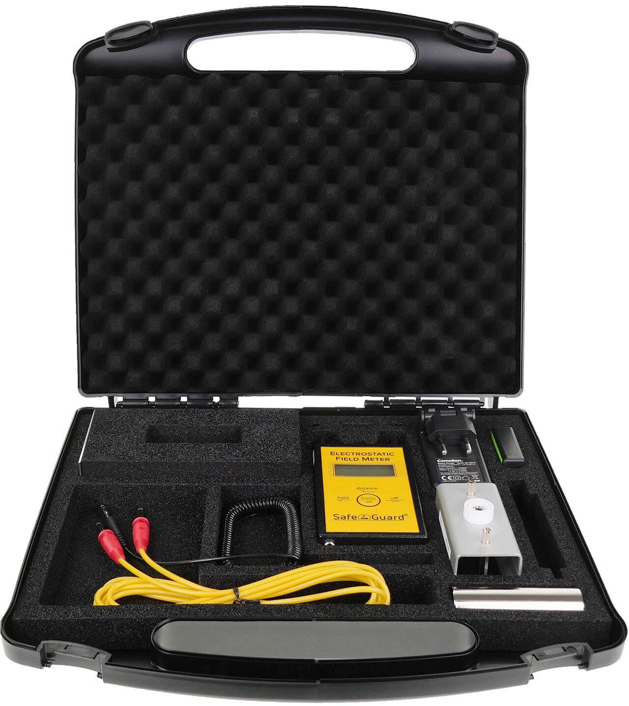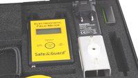 | Lieferumfang | • Elektrofeldmeter (EFM) von SafeGuard • ESD Koffer mit Schaumstoffeinlage • 1x 9V NiMH-Akku • Steckerladegerät für 9V-Akku • MK Spannungsmesskopf • Handelektrode • Standfuß • 2m Silikonkabel • Abgreifklemme • Bedienungsanleitung |