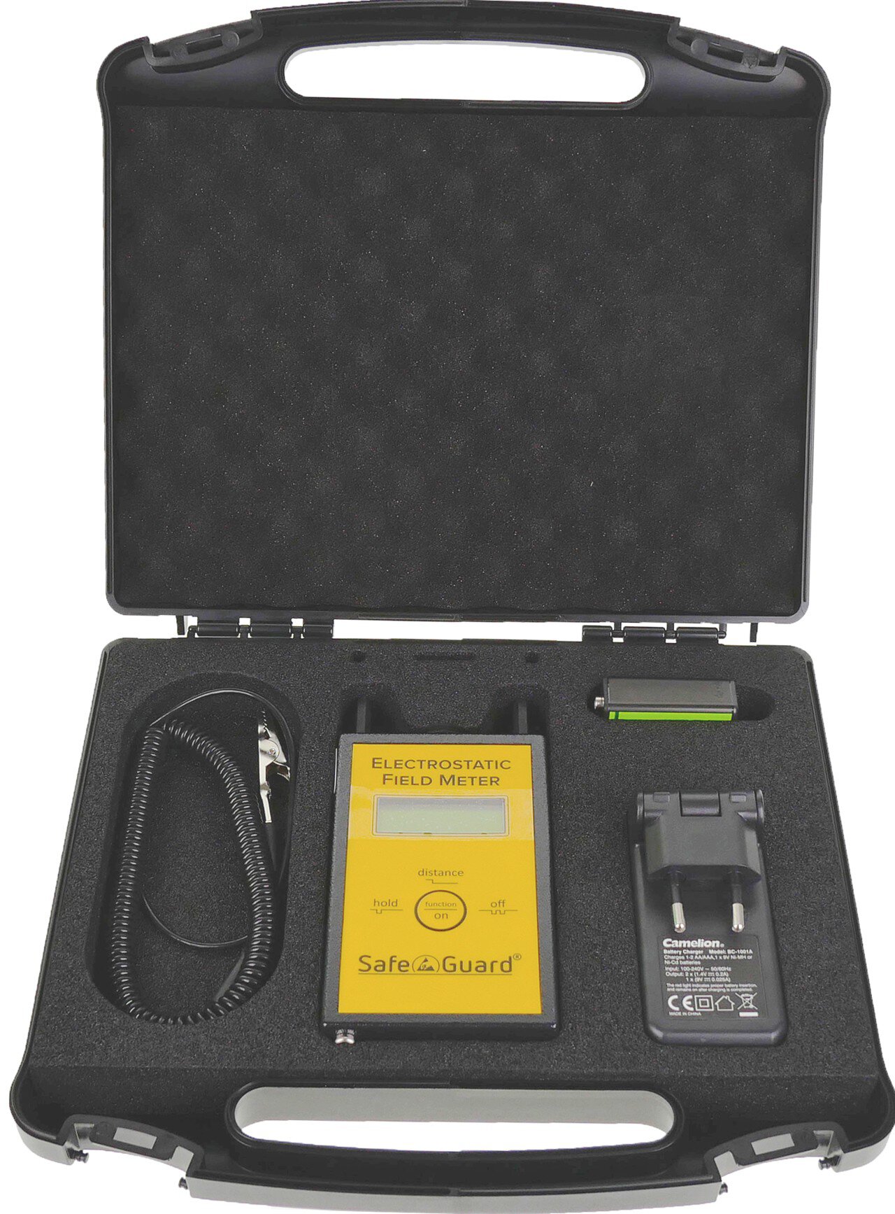 | Lieferumfang | • Elektrofeldmeter (EFM) von SafeGuard • ESD Koffer mit Schaumstoffeinlage • 2x 9V-NiMH-Akku • Steckerladegerät für 9V-Akku • Spiralkabel mit Abgreifklemme • Bedienungsanleitung • Kalibrationszertifikat |