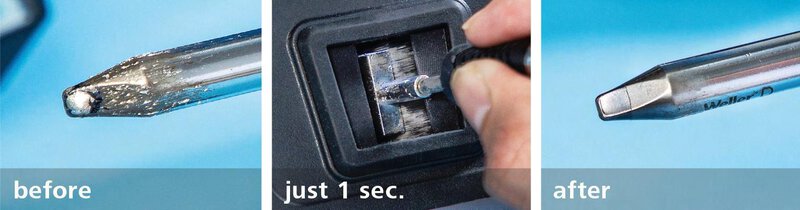 • Bessere Wärmeübertragung liefert gleichbleibend hochwertige Lötergebnisse. Die optimale Spitzenpflege verlängert die Lebensdauer der Spitze im Vergleich zur manuellen Reinigung um bis zum 2fachen.