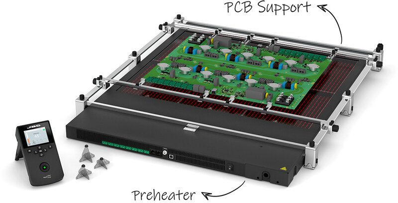 Es handelt sich um ein komplettes System aus Vorwärmer und Leiterplattenträger zum Vorwärmen großer Leiterplatten, wie z. B. Kommunikationsplatinen, Flugzeuge usw., und ideal für sich wiederholende Lötarbeiten. Es bietet eine Heizfläche von 510 x 610 mm / 20.07 x 24 in. mit 6 unabhängigen Arbeitszonen (255 x 203 mm / 10.04 x 8 in), die ein-/ausgeschaltet werden können.