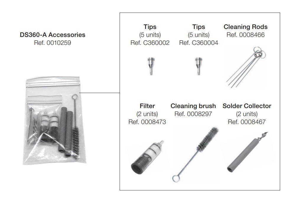 Entdecken Sie das umfassende Zubehörset für den DR560 auf Weidinger.eu. Dieses Set enthält fünf Spitzen C360002 und fünf Aufsätze C360004, die präzises Arbeiten ermöglichen. Zur optimalen Pflege und Wartung sind ein Satz Reinigungsstäbchen 00084664, ein Filter 0008473 und eine Reinigungsbürste 0008297 enthalten. Der Lotauffangbehälter 0008467 sorgt für eine saubere Arbeitsumgebung. Ideal für professionelle Anwender, die Wert auf Qualität und Effizienz legen.