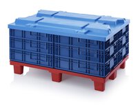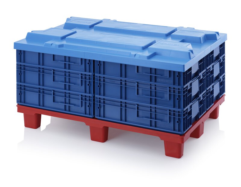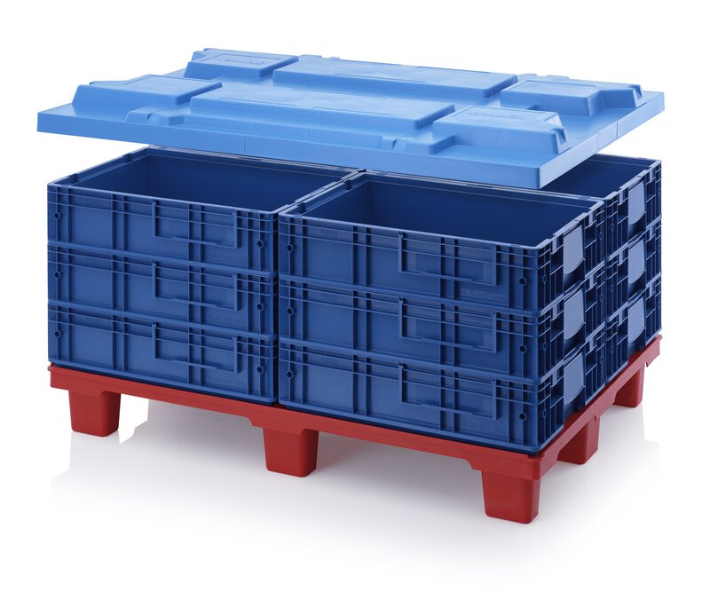 Abdeckung Deluxe! Der Paletten-Auflagedeckel für KLT-Behälter von AUER Packaging ist an die speziellen Eigenschaften von KLTBehältern angepasst und schützt palettierte Waren vor äußeren Einflüssen. Integrierte Umreifungsnuten ermöglichen die Sicherung der Ware mit Spanngurten. Gegen Verrutschen einer darauf gestapelten Palette sorgen zusätzliche Stege.