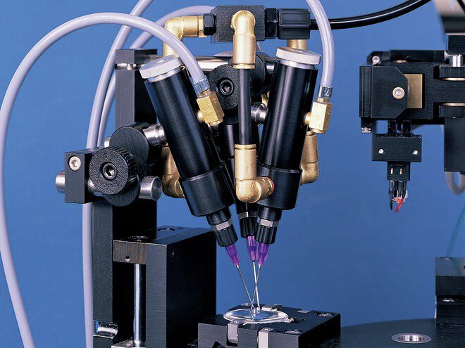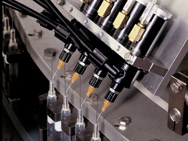 Das Dosierventil der Serie 741V ist einfach zu bedienen und kann viele Millionen Zyklen ohne Wartung arbeiten. Präzisionsnadelventile dosieren niederviskose Flüssigkeiten in sauberen und wiederholgenauen Mengen. Da die aus Edelstahl gebaute Ventilnadel direkt im Dosiernadeleingang abschließt, gibt es im Ventil so gut wie kein Totvolumen. Die Ventile sind ideal für den Einsatz an Montageautomaten. Das Luftzylindergehäuse und das Flüssigkeitsgehäuse bestehen aus hartbeschichtetem, eloxiertem Aluminium.