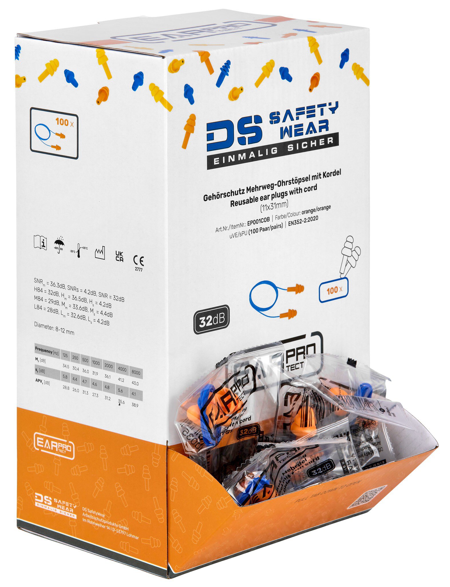DS Safetywear präsentiert die ultimativen EarProtect Mehrweg Ohrstöpsel für optimalen Gehörschutz. Diese Ohrstöpsel aus lamellenförmigem Silikon bieten einen beeindruckenden SNR-Wert von 32 dB und sind in leuchtendem Orange erhältlich. Dank der praktischen Kordel sind sie einfach zu verwenden und helfen, den Verlust der Ohrstöpsel zu vermeiden. Trotz ihrer Wiederverwendbarkeit garantieren sie jederzeit höchste Sicherheit und Komfort. Sorge mit den EarProtect Ohrstöpseln von DS Safetywear für den perfekten Schutz deiner Ohren!