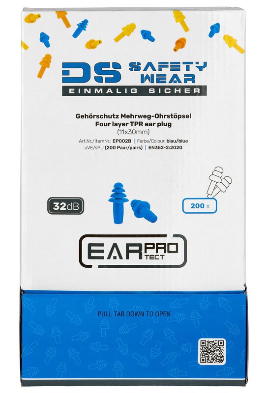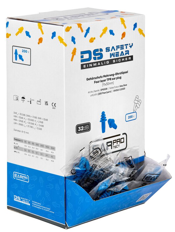 Die DS Safetywear EarProtect Mehrweg Ohrstöpsel aus lamellenförmigem TPE in blauer Farbe bieten einen hohen Schutz mit einem SNR von 32 dB. Die Ohrstöpsel sind ohne Kordel und ideal für den Einsatz in lauten Umgebungen. Dank ihrer Wiederverwendbarkeit sind sie eine nachhaltige und kosteneffiziente Lösung für Gehörschutz. Überzeuge dich jetzt von der Qualität und dem Komfort der DS Safetywear Ohrstöpsel!