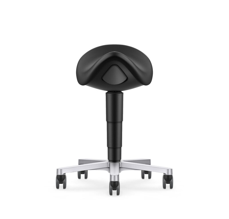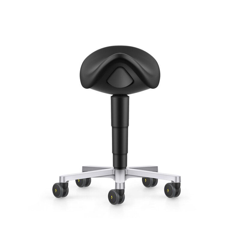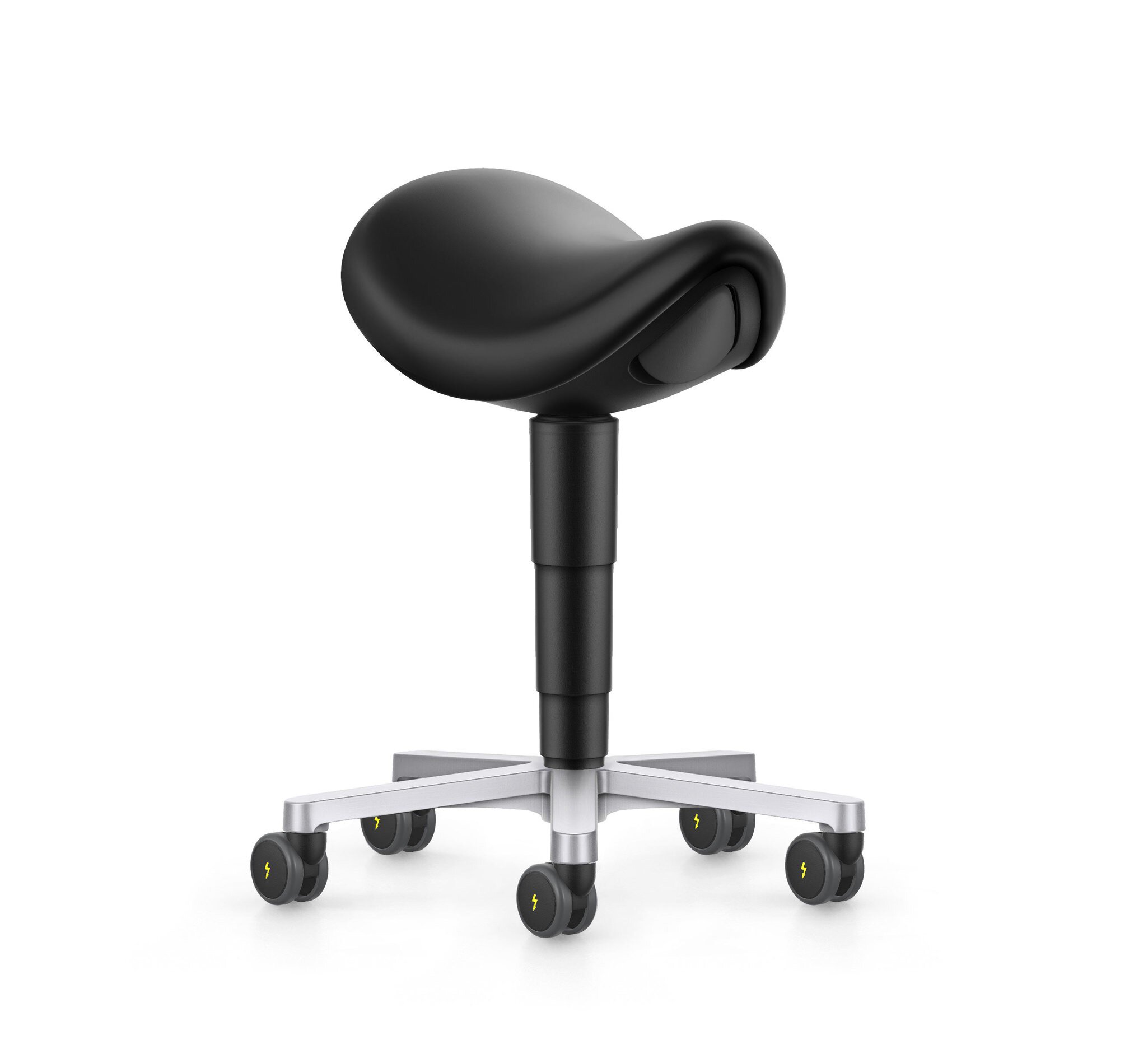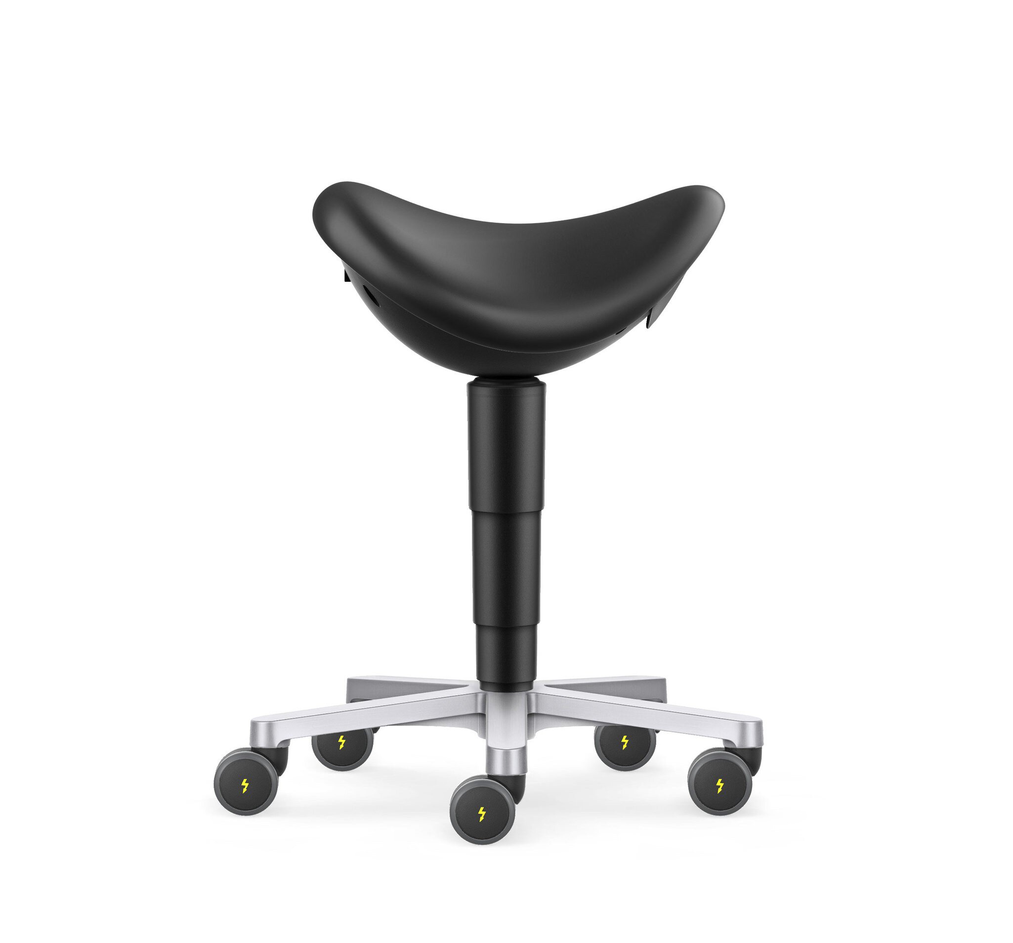Dieser Sattelhocker ist gemäß EN 61340-5-1 leitfähig und eignet sich daher ideal für den Einsatz in ESD-sensiblen Umgebungen. Die Sitzhöhe ist verstellbar von 540 mm bis 800 mm, um individuellen Anforderungen gerecht zu werden. Das polierte Aluminium Fußkreuz rundet das moderne Design ab und sorgt für Stabilität.