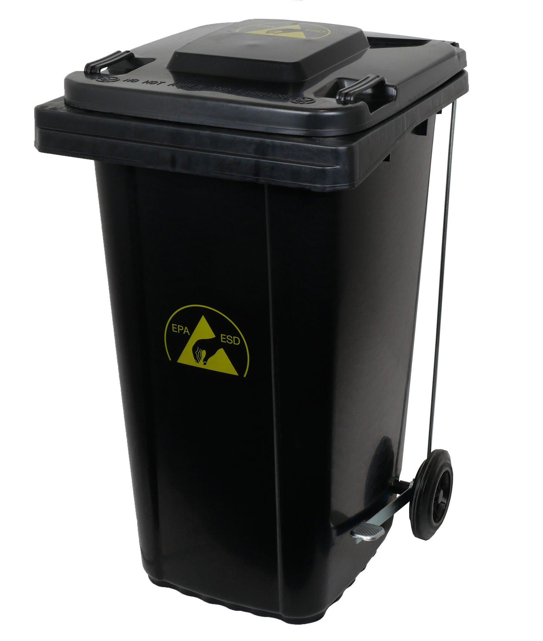 Die ESD Mülltonne besteht aus leitfähigen ESD-Kunststoff und schützt zuverlässig vor statischen Entladungen, wodurch sie ideal für den Einsatz in ESD-geschützten Bereichen geeignet ist. Der integrierte Fußhebel ermöglicht ein hygienisches und bequemes Öffnen des Deckels, ohne die Hände benutzen zu müssen.