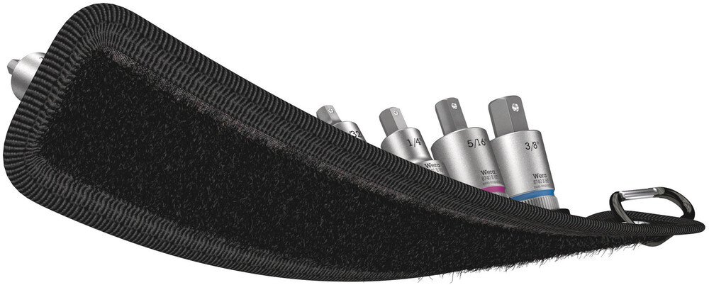 Robuster Textilgurt (Belt) im typischen Wera Design mit 8 Bitnüssen auf engstem Raum. Ein leichtgängiger Drehmechanismus sorgt für einen sicheren Halt und leichte Entnahme der Nüsse. Mit Take it easy Werkzeugfinder mit Farbkennzeichnung nach Größen - zum einfachen und schnellen Finden des benötigten Werkzeugs. Inklusive Karabinerhaken zur Befestigung an Gürtelschlaufen oder Taschen. Besonders kurze, stabile Bit-Nüsse mit den Vorzügen der Wera Bit-Technologie. Bitnüsse mit Haltefunktion für besonders komfortables Schrauben und reduzierter Gefahr des Schraubenverlustes beim Zuführen zum Werkstück. Mit Vliesrücken und Klettklebestreifen zur einfachen Befestigung z.B. an Wand, Regal, Werkstattwagen und Wera 2go Werkzeugtransportsystem.