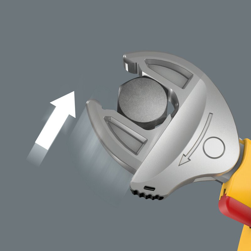Stückgeprüftes Werkzeug gem. IEC 60900 bei 10.000 V für sicheres Arbeiten bei der zugelassenen Spannung von 1.000 V. Der verstellbare VDE Maulschlüssel greift stufenlos und automatisch alle Sechskantgrößen im angegebenen Abmessungsbereich - metrisch und zöllig. Der integrierte Hebelmechanismus klemmt die Sechskant-Schraube bzw. -Mutter zwischen den Backen sicher ein, was die Gefahr des Abrutschens und der Beschädigungen deutlich verringert. Die Ratschenfunktion sorgt für schnelles und durchgängiges Schrauben ohne Absetzen. Durch die Nutzung der Eckweiten-Prismen ist ein Rückschwenkwinkel von nur 30° realisierbar. Die Ein-Schenkel-Konstruktion in Verbindung mit der Ratschenfunktion und dem Eckweitenprisma ermöglicht das Arbeiten auch in engen Bauräumen. Der verstellbare Joker 6004 VDE verfügt dank der 2-Komponenten-Kunststoffisolierung über einen haptisch angenehmen Griff. Die Sicherheit wird durch den Abrutschschutz am vorderen Griffende erhöht. Zusätzlicher Schutz durch die Schiebefunktion für kontaktloses und sicheres Öffnen der nicht-isolierten Backen.
