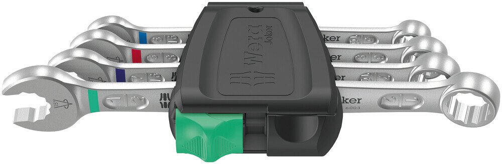 Da die Bauräume bei Schraubarbeiten immer enger werden, sind Werkzeuge notwendig, mit denen die Anwender auch in solchen Situationen erfolgreich arbeiten können. Enge Bauräume erfordern zusätzliche Ansetzpunkte des Werkzeugs. Lassen sich also Maulschlüssel derart modifizieren, dass sich die Ansetzmöglichkeiten des Werkzeugs erhöhen? Durch die Kombination des um 7,5° geschwenkten Mauls und die Doppelsechskantgeometrie wird eine Verdopplung der Ansetzpunkte erzielt. Bei einer wiederholten 180°-Drehung des Schlüssels um die Längsachse während des Schraubens gibt es vier Ansetzmöglichkeiten und Muttern bzw. Schraubenköpfe können alle 15° "gepackt" werden. Der Joker 6003 mit seiner pfiffigen Maulgeometrie erweitert das Anwenderspektrum in engen Bauräumen deutlich. Den jeweiligen Ansetzpunkt findet der Joker 6003 nach jedem Wenden sozusagen von selbst. Die schlanke und dennoch robuste Ringseite ist um 15° zur Werkzeugachse abgewinkelt. Durch die hochwertige Oberflächenvergütung wird ein hoher und lang anhaltender Korrosionsschutz erzielt. Mit Werkzeugfinder Take it easy: Farbkennzeichnung nach Größen. Das verschleißfreie Material des Clips garantiert den sicheren Halt der Maulschlüssel bei gleichzeitiger einfacher Entnahme.
