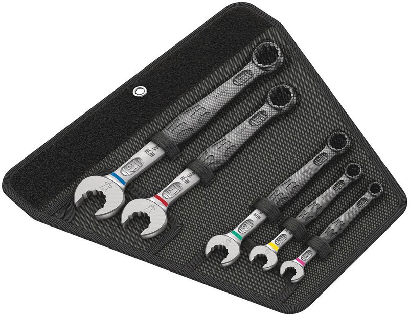 Da die Bauräume bei Schraubarbeiten immer enger werden, sind Werkzeuge notwendig, mit denen die Anwender auch in solchen Situationen erfolgreich arbeiten können. Enge Bauräume erfordern zusätzliche Ansetzpunkte des Werkzeugs. Lassen sich also Maulschlüssel derart modifizieren, dass sich die Ansetzmöglichkeiten des Werkzeugs erhöhen? Durch die Kombination des um 7,5° geschwenkten Mauls und die Doppelsechskantgeometrie wird eine Verdopplung der Ansetzpunkte erzielt. Bei einer wiederholten 180°-Drehung des Schlüssels um die Längsachse während des Schraubens gibt es vier Ansetzmöglichkeiten und Muttern bzw. Schraubenköpfe können alle 15° "gepackt" werden. Der Joker 6003 mit seiner pfiffigen Maulgeometrie erweitert das Anwenderspektrum in engen Bauräumen deutlich. Den jeweiligen Ansetzpunkt findet der Joker 6003 nach jedem Wenden sozusagen von selbst. Die schlanke und dennoch robuste Ringseite ist um 15° zur Werkzeugachse abgewinkelt. Durch die hochwertige Oberflächenvergütung wird ein hoher und lang anhaltender Korrosionsschutz erzielt. Mit Werkzeugfinder Take it easy: Farbkennzeichnung nach Größen. Die Joker Taschen sind durch das Klettsystem auf der Rückseite zur Befestigung an Wand, Regal, Werkstattwagen und am Wera 2go System geeignet.