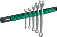 Ringmaulschlüssel-Set, 5-teilig, metrische Größen; auf Klemmleiste. Der Joker 6003 erzielt durch die Kombination des um 7,5° geschwenkten Mauls und der Doppelsechskantgeometrie eine Verdopplung der Ansetzpunkte. Bei einer wiederholten 180°-Drehung des Schlüssels um die Längsachse während des Schraubens gibt es vier Ansetzmöglichkeiten und Muttern bzw. Schraubenköpfe können alle 15° "gepackt" werden. Dadurch wird das Verschrauben besonders in engen Bauräumen deutlich einfacher. Die schlanke und dennoch robuste Ringseite ist um 15° zur Werkzeugachse abgewinkelt. Durch die hochwertige Oberflächenvergütung wird ein hoher und lang anhaltender Korrosionsschutz erzielt. Mit Werkzeugfinder Take it easy: Farbkennzeichnung nach Größen. Die Klemmen der Leiste sorgen für perfekten Halt der Werkzeuge. Die Leiste hält durch starken Magnet sicher an Metallflächen. Alternativ kann die Leiste auch an eine Wand geschraubt werden.